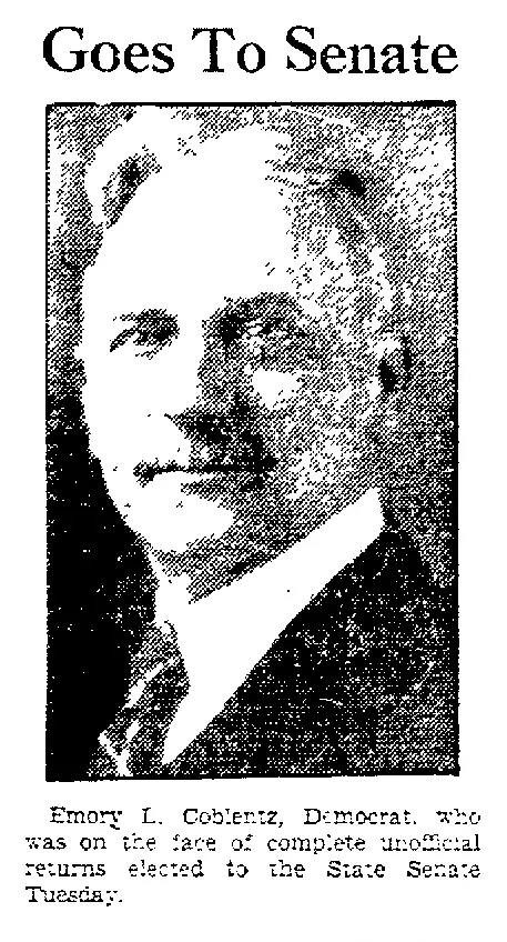 In 1930, Coblentz won election to the State Senate, defeating Edward Delaplaine, who later became an esteemed judge in Frederick. But, his only term yielded little in the way of notable change or success because of problems that arose in 1931.