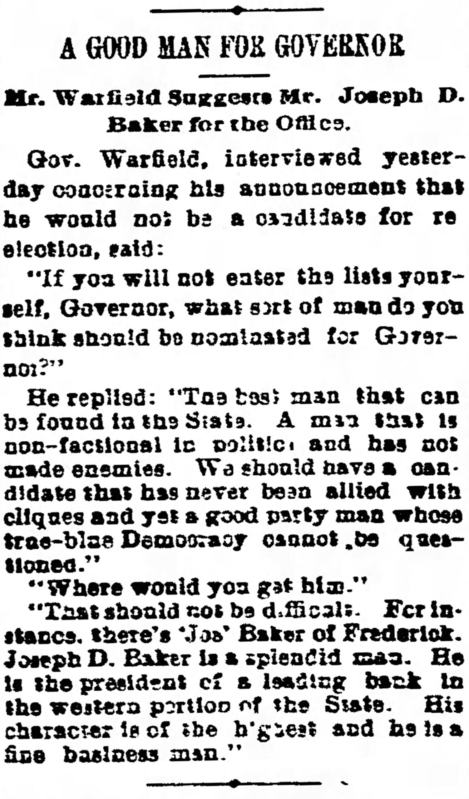 In 1907, support emerged for Baker as a Democratic candidate for governor, locally as well as in Balti-more (where state power brokers operated). Baker, himself, was ambivalent but agreed to have his name advanced despite refusing to campaign.